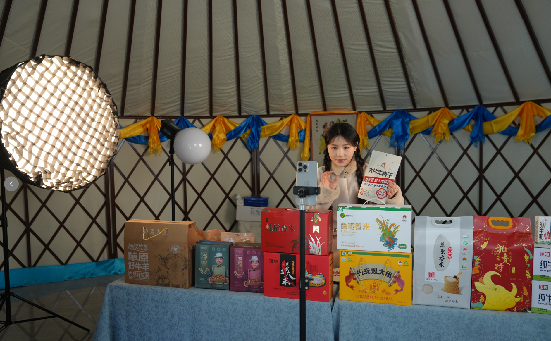 在興安盟扎賚特旗冷鏈物流園,主播通過直播推介產(chǎn)品。