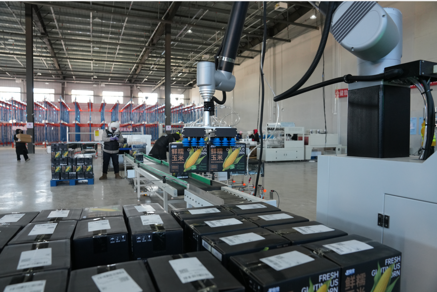 在興安盟扎賚特旗冷鏈物流園,自動(dòng)機(jī)械臂正在搬運(yùn)貨物。