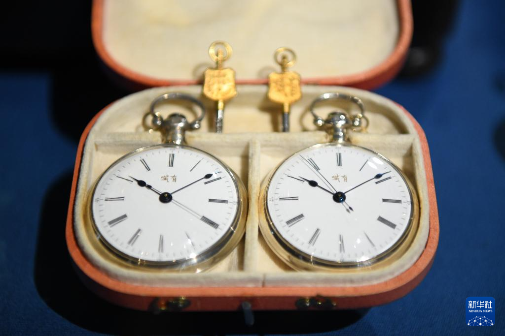 這是4月12日在瑞士拉紹德封的國際鐘表博物館內(nèi)拍攝的一對播威品牌懷表。這對懷表大約制作于1880年,是當(dāng)時向中國出口的款式,寓意“成雙成對”。